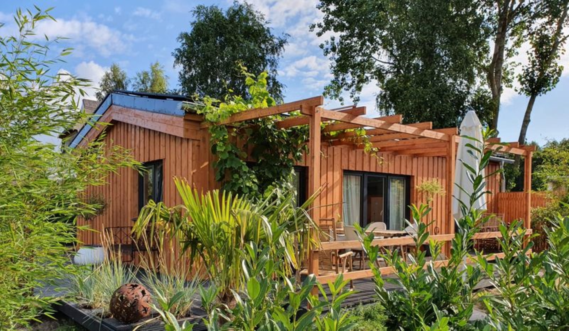 Dieses hochwertige Holzhaus mit großer Sonnenterrasse und